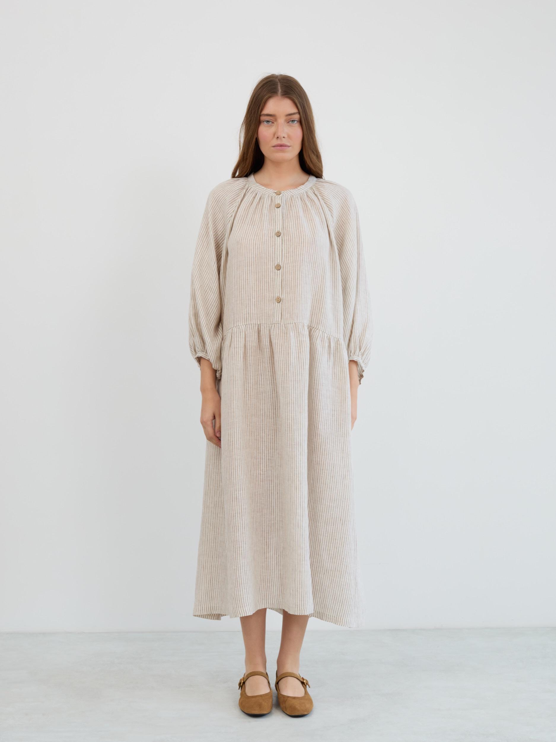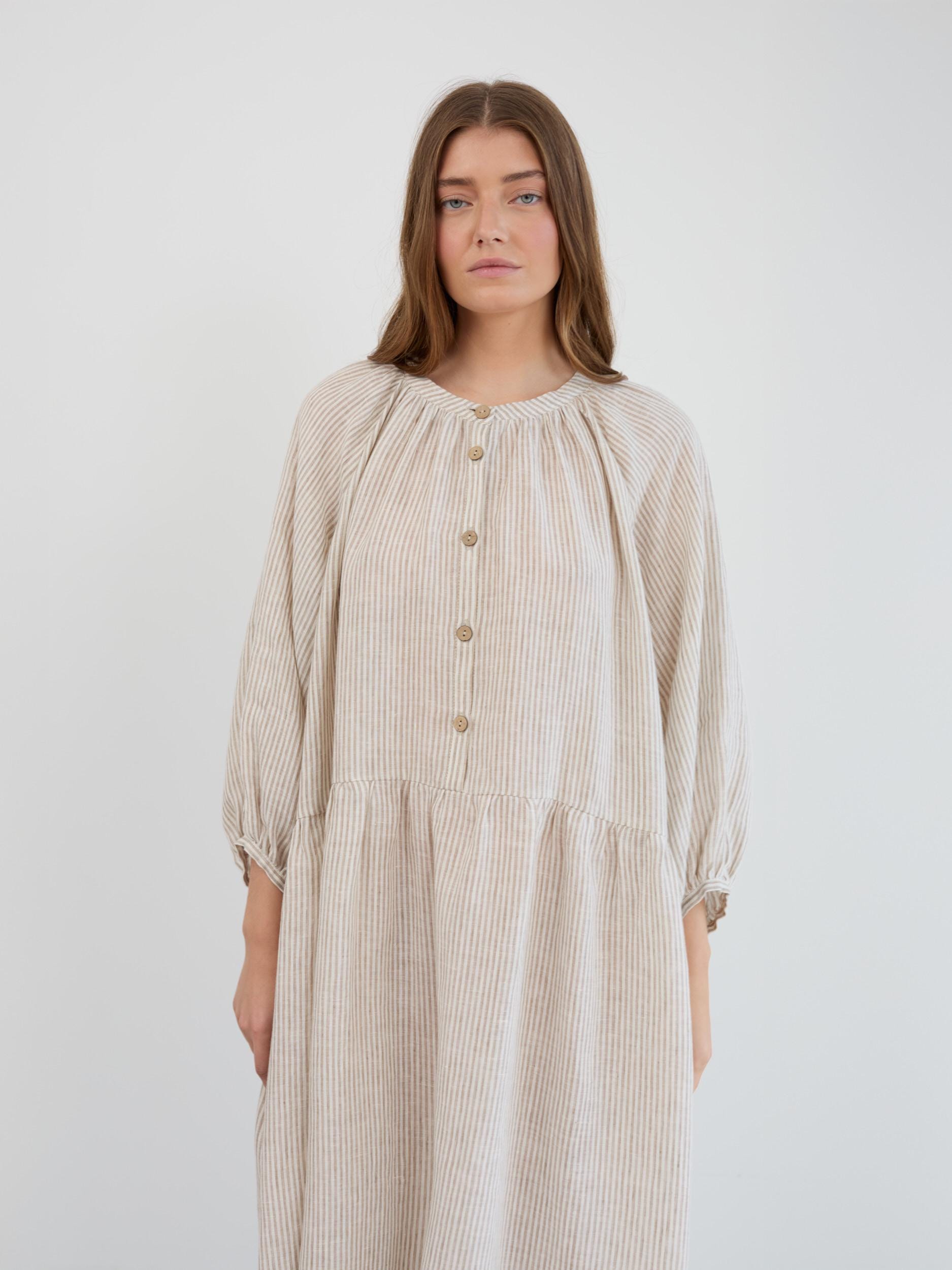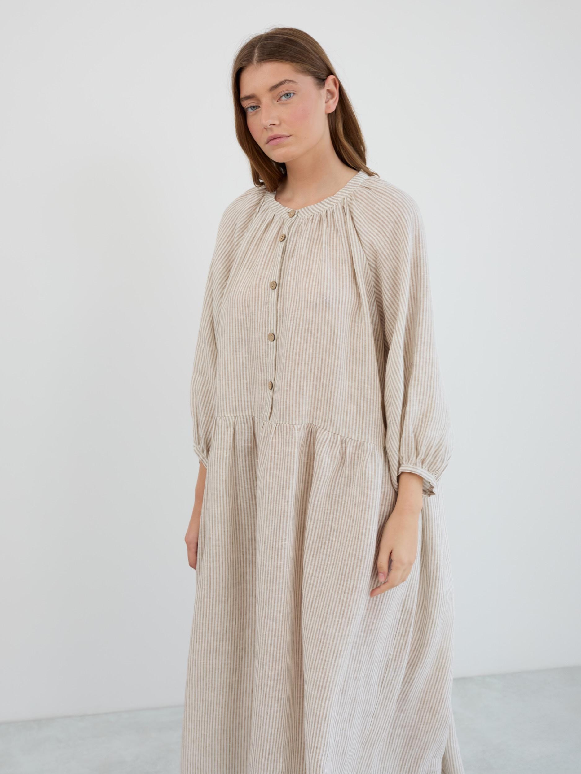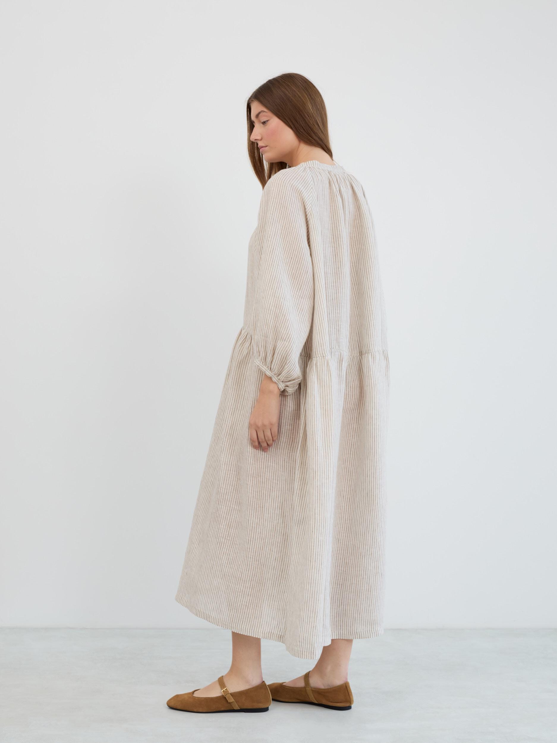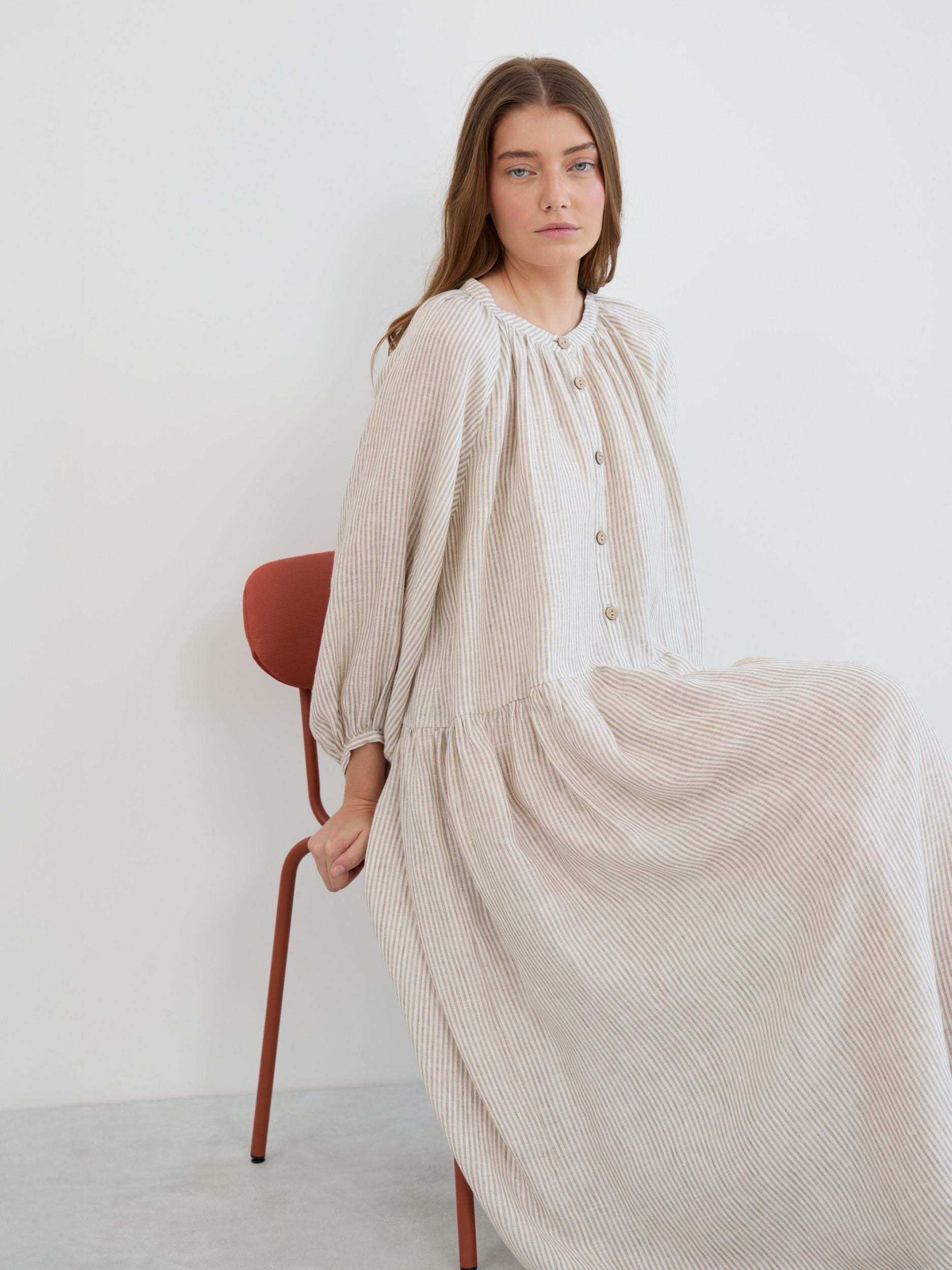 ETTA is a relaxed linen maxi dress with a gathered round neckline and button-down front. Its loose, flowing shape and dropped waist create an easy silhouette with a tiered gathered skirt that moves beautifully. Cut from European linen with 3/4 balloon sleeves and elastic cuffs, this boho linen dress is the kind of piece you reach for all year round. Featured in Beige White Stripes, with more colors available in the dropdown menu above.
